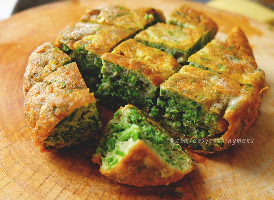 4.ใส่น้ำมันมากหน่อยเหมือนเจียวไข่ปกติ เปิดไฟกระทั่งน้ำมันร้อน ใส่ไข่ผสมชะอมลงไป เกลี่ยชอมให้ทั่ว พอไข่เริ่มเซทตัว ให้กลับด้าน เบาไฟลงนิดหน่อย