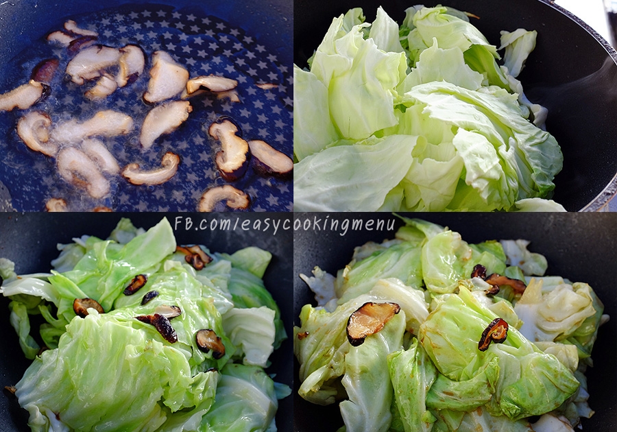 - ใส่กะหล่ำปลีลงไป ไม่ต้องรีบคลุกทิ้งไว้สักครู่ จากนั้นค่อยๆตลบกะหล่ำปลีให้สุกเกือบทั่ว ตลบมารวมตรงกลางกระทะ