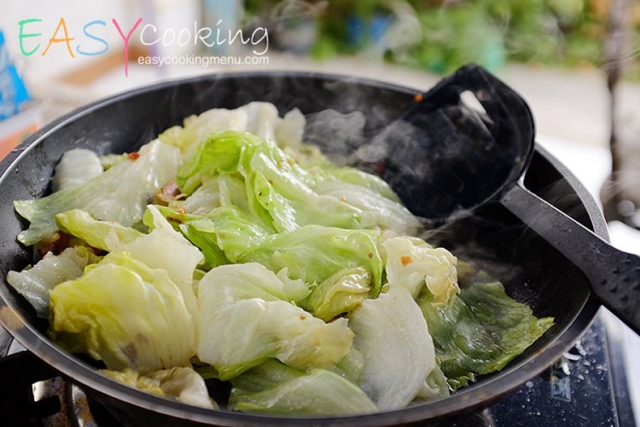 ฉีกผักกาดแก้วเป็นชิ้นๆ เล็กใหญ่ตามชอบล้างให้สะอาด จากนั้นตั้งกระทะเจียวกระเทียม ไม่ต้องเหลืองมากนะคะ แค่พอมีกลิ่นหอม (หรือใครอยากจะใส่กระเทียมไปพร้อมกันกับผักกาดแก้วก็ไม่ว่ากันค่ะ)
