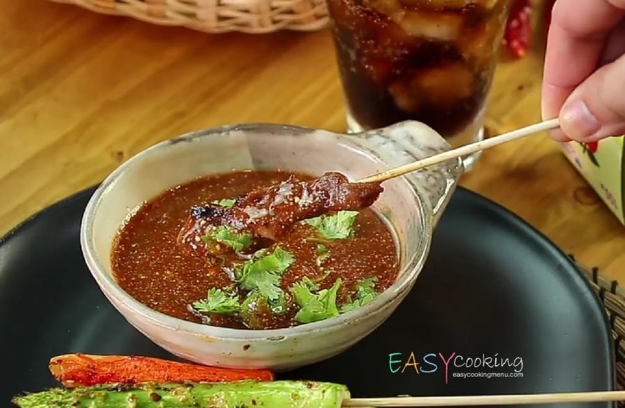 นำเนื้อเสียบไม้มาปิ้งทาด้วยทาด้วยซอสหอยนางรม แล้วทาทับด้วยน้ำพริกหม่าล่าผสมน้ำมันปิ้งจนสุก