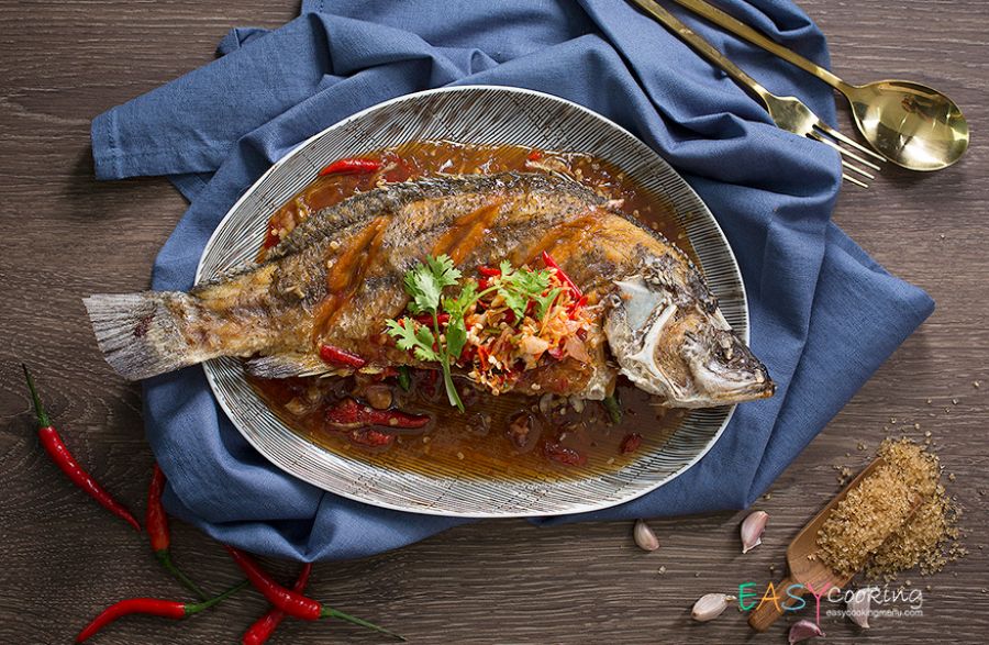 1. ปลากระพง ล้างทำความสะอาด ซับให้แห้ง จากนั้นนำลงทอดในน้ำมันร้อนไฟกลาง  จนสุกเหลืองทั้งสองด้าน