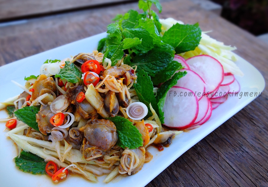 - นำเนื้อหอยแครงลวกใส่ชามผสม ตามด้วยตะไคร้ มะม่วงสับ และพริกขี้หนูซอย สาระแหน่นิดหน่อย พักไว้