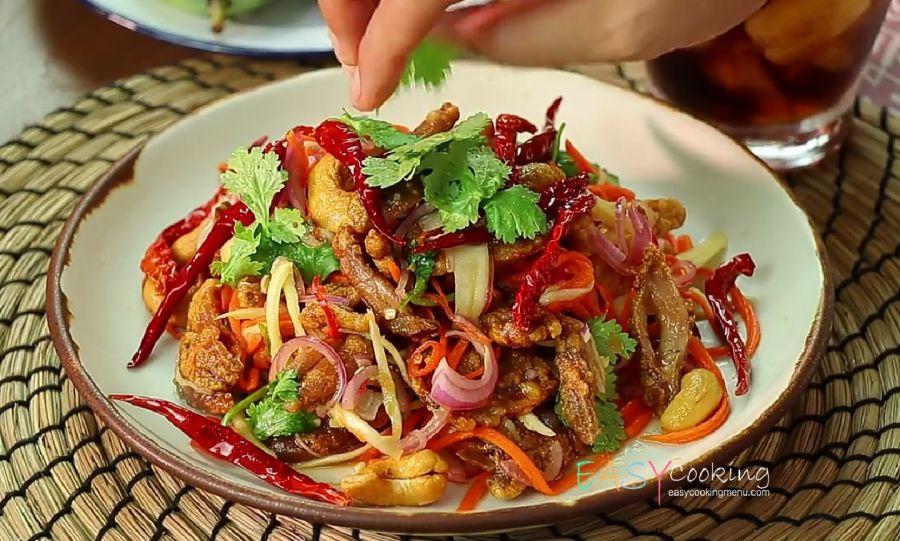 1. ทอดเม็ดมะม่วงหิมพานต์ในน้ำมันใช้ไฟอ่อนจากนั้น ทอดพริกแดง จนพริกแห้งกรอบตักขึ้น