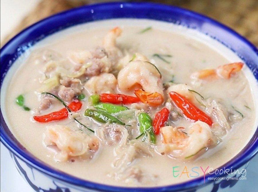 4. ปรุงรสด้วยน้ำตาลปิ๊บ ใส่หอมแดง ใบมะกรูดซอย พริกขี้หนูสวน คนให้เข้ากัน รอเดือดอีกครั้งปิดไฟ พร้อมตักเสิร์ฟพร้อมผักสดตามชอบ