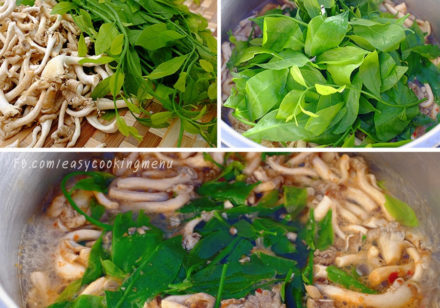 2. พอน้ำเดือดใส่เห็ด เดือดอีกครั้งใส่ผักหวาน พอผักสลบ ปิดไฟ พร้อมเสริฟ