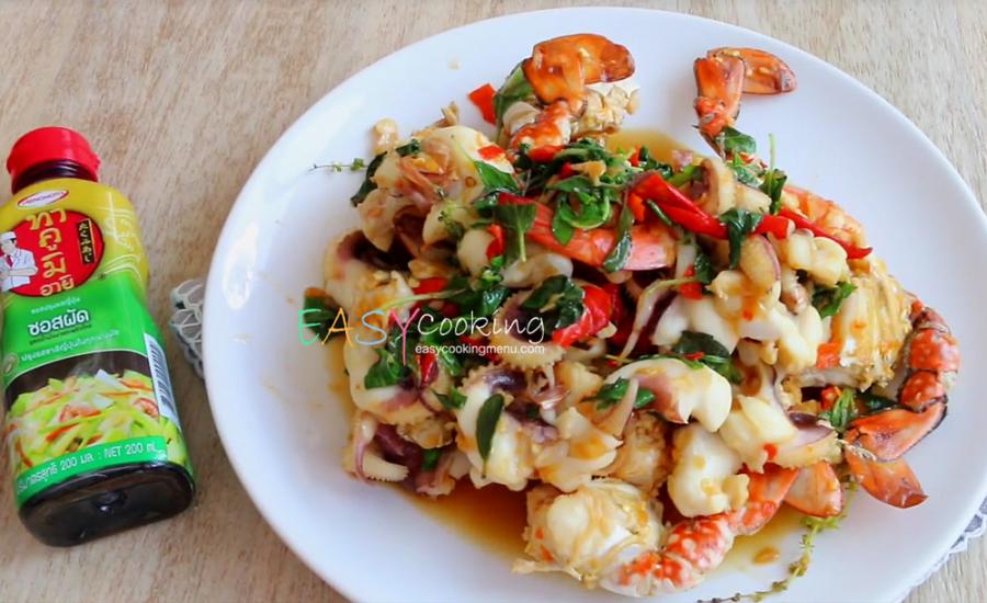 ทะเลทั้งหมดลวกสุกก่อนนำไปผัดจะสามารถควบคุมปริมาณน้ำได้ น้ำจะไม่มากเกินไปนัก เพราะอาหารทะเลเช่นปลาหมึก เมื่อโดนความร้อน จะคายน้ำออกมาส่วนหนึ่ง ทำให้มีโอกาสน้ำมากเกินไปได้