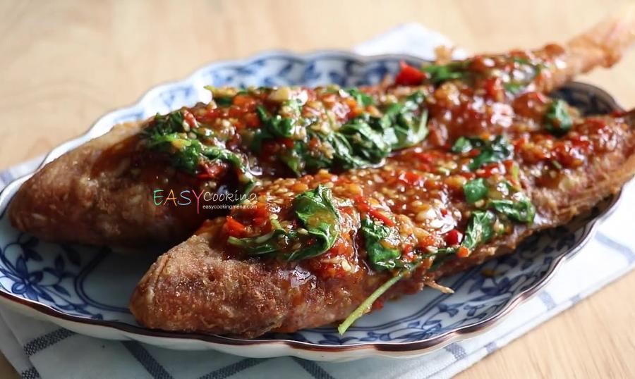 - ตั้งกระทะใส่น้ำมันเล็กน้อย ผัดพริกกระเทียมสับ เติมน้ำเปล่า ซีอิ๊วขาว ซอสหอยนางรม และน้ำตาลทราย ตามด้วยใบกระเพราผัดจนหอมแล้วนำไปราดบนตัวปลา
