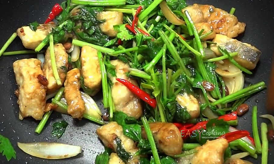 - ใส่เนื้อปลาทอด ขึ้นฉ่าย และ พริกชี้ฟ้าลงไป ผัดพอให้ขึ้นฉ่ายสลด ตักขึ้นพร้อมเสิร์ฟ