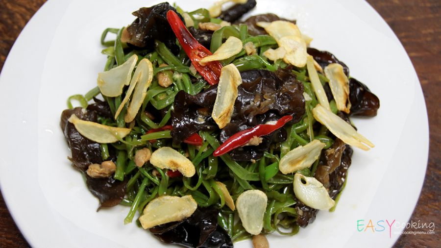 4. ใส่เห็ดหูหนู ตามด้วยผักบุ้ง เร่งไฟให้แรงขึ้นผัดจนผักบุ้งสลดตักใส่จาน โรยด้วยกระเทียมทอด พร้อมเสริฟ