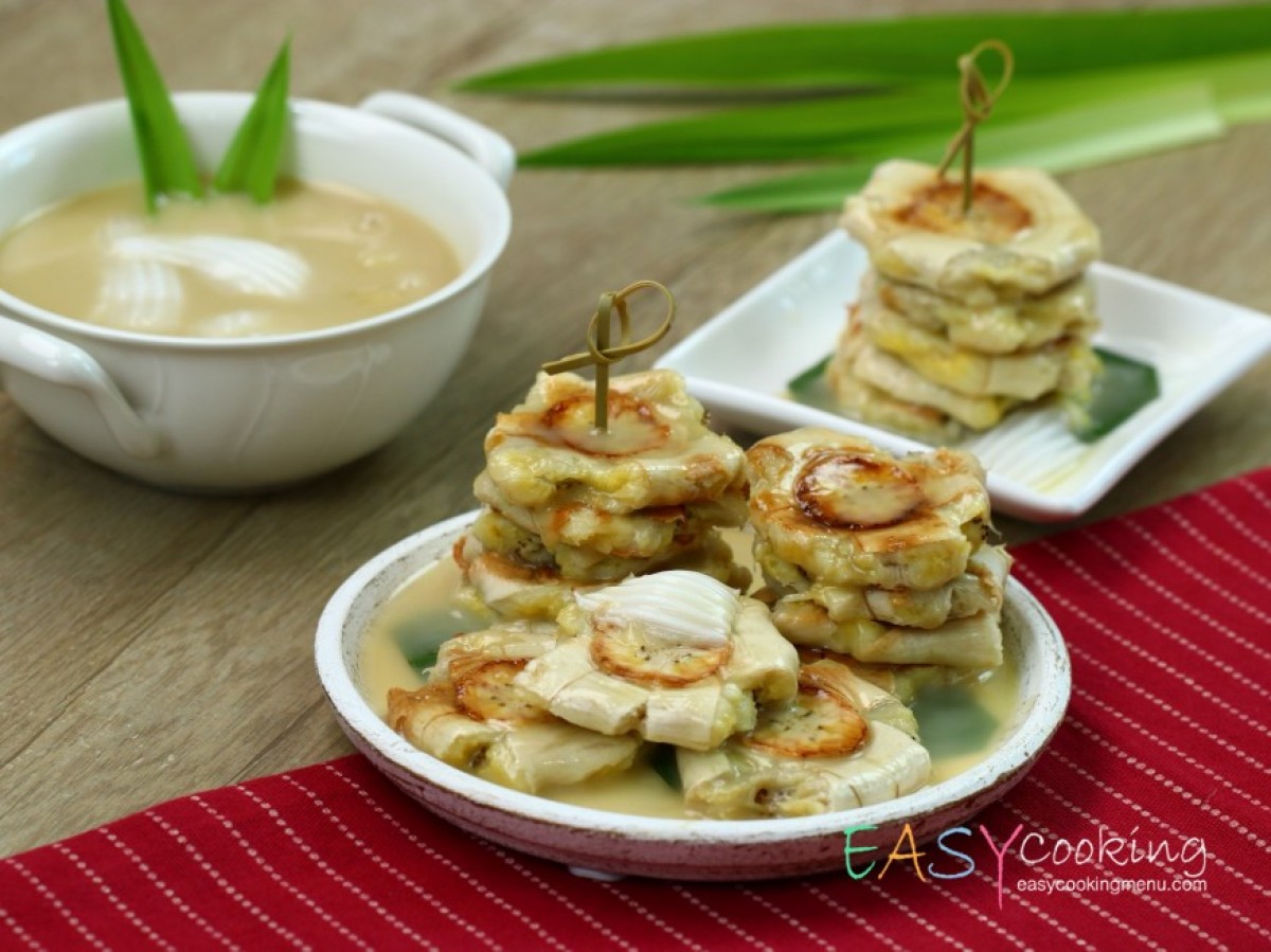 - นำกะทิเทใส่หม้อ และน้ำมะพร้าว น้ำตาลมะพร้าว น้ำตาลโตนดและเกลือ เคี่ยวส่วนผสมให้เข้ากัน คนอย่างต่อเนื่องใช้ไฟแรงปานกลาง