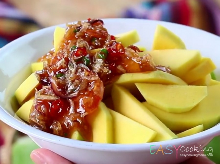 - ใส่กุ้งแห้งฝอยขาว กุ้งแห้งใหญ่ หอมแดง พริกเขียวแดงจินดาซอย คนให้เข้ากันอีกครั้ง พักให้เย็น เสิร์ฟพร้อมมะม่วง