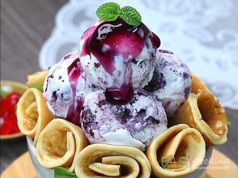 - เสิร์ฟพร้อมกับไอศกรีมครีมชีสบลูเบอร์รี