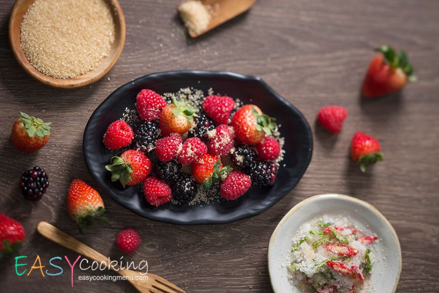 3. นำสตรอเบอร์รี่ ราสเบอร์รี่ คลุกกับพริกเกลือ หรือ จิ้ม ตามความชอบ