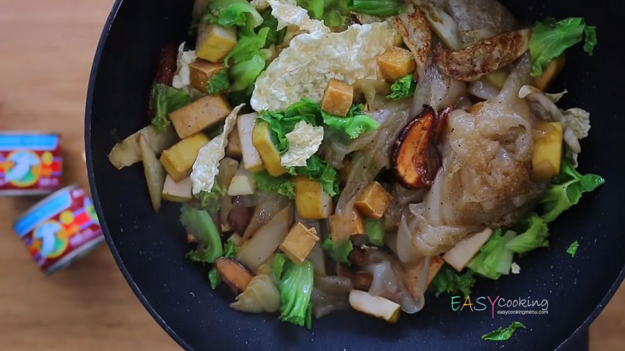 1. ตั้งกระทะใส่น้ำมันพืช ใส่เห็ดหอมผัดจนหอมใส่เต้าหู้เหลืองผักกาดดอง เส้นก๋วยเตี๋ยว