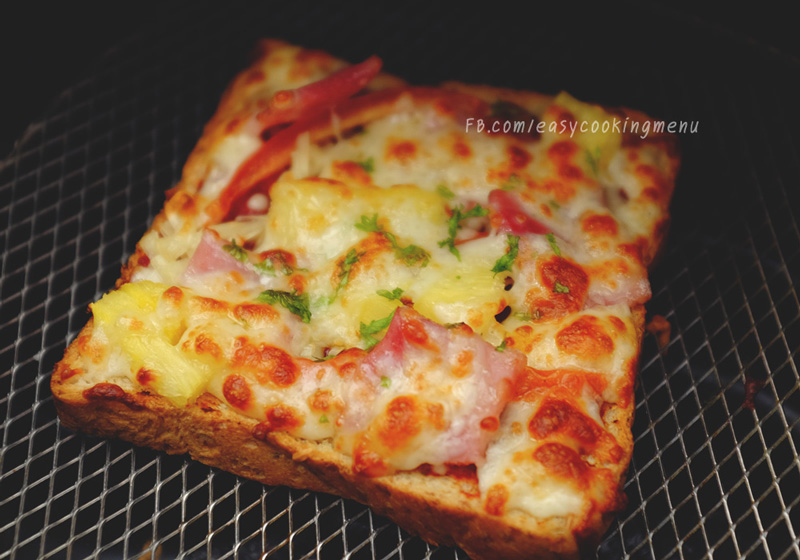 1. นำขนมปังทาด้วยซอสมะเขือเทศ จากนั้นวางมะเขือเทศลงไป ตามด้วย แฮมและสับประรด