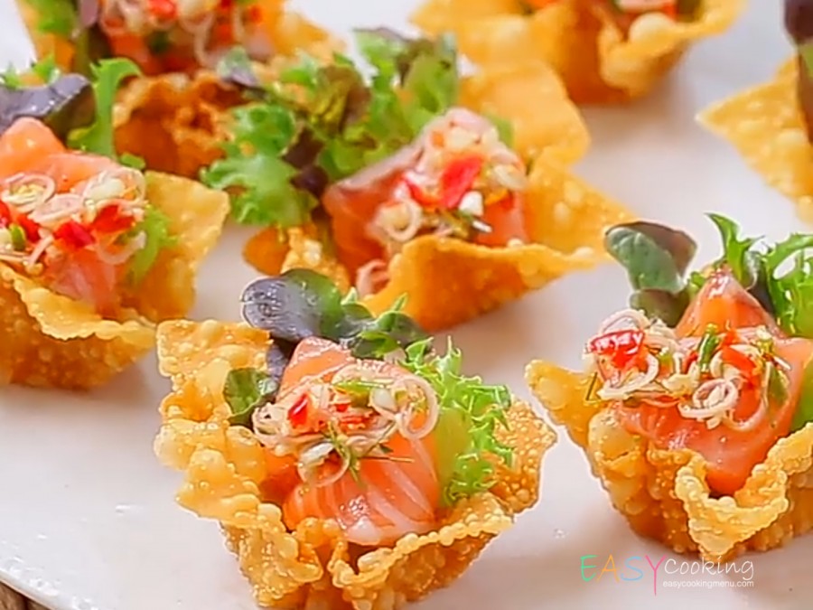 4. นำกระทงเกี๊ยวจัดใส่จานเสิร์ฟวางรองด้วยผักสลัดจากนั้นใส่เนื้อปลาแซลมอนลงไป