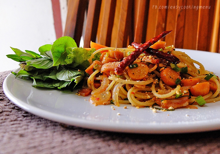 - ใส่เส้นสปาเกตตี้ลงไปคลุก ตามด้วยผักชีฝรั่ง ต้นหอมซอย ใบมะกรูดหั่นฝอย เคล้าให้เข้ากันโรยด้วยข้าวคั่วหอมๆกรอบๆ จัดเสริฟแต่งหน้าด้วยพริกทอด ทานกับผักสดตามชอบ
